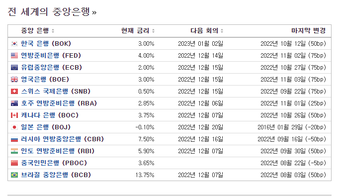 위 사이트는 국가별 중앙은행의 기준금리와 최근 변경일, 그리고 다음 변경이 결정되는 회의 일자를 확인할 수 있습니다. 기준 금리뿐만 아니라. 환율, 지수, 주식, 채권, 암호화폐 등 다양한 정보를 한 곳에서 모두 확인하실 수 있는 사이트입니다.